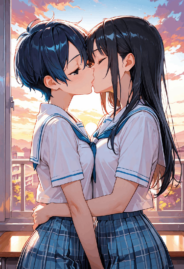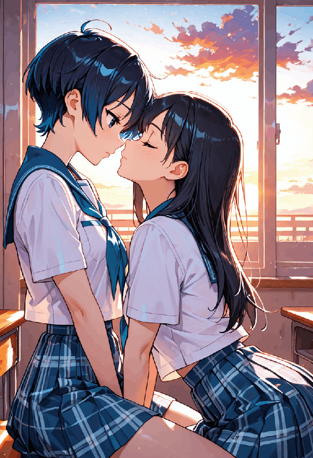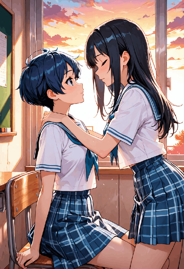 放課後の教室で黒髪ロング×ボーイッシュの百合カップルがイチャイチャKISS